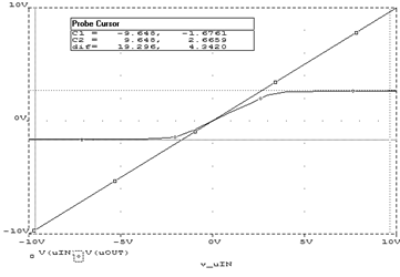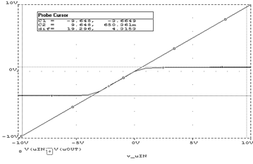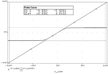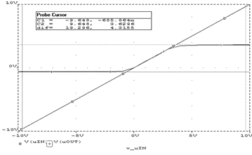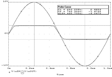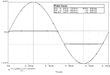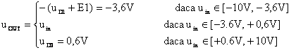 Pe baza variatiei tensiunii uOUT functie de variatia tensiunii uIN (vezi relatia pentru uOUT si figura 4.4b) se obtine o reprezentarea grafica pentru uOUT când uIN este semnal sinusoidal conform figurii 4.4d .