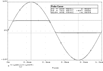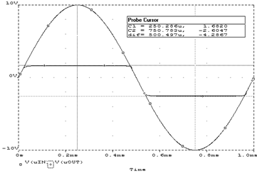 Pe baza variatiei tensiunii uOUT functie de variatia tensiunii uIN (vezi relatia pentru uOUT si figura 4.1b) se obtine o reprezentarea grafica pentru uOUT când uIN este semnal sinusoidal conform figurii 4.1d .