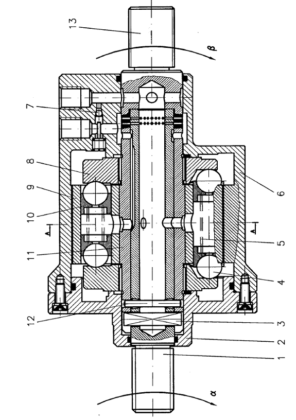Industria moderna utilizeaza numeroase tipuri de servomecanisme mecanohidraulice rotative formate din motoare hidraulice volumice rotative si distribuitoare de urmarire. Dintre aceste servomecanisme, cel mai compact si cel mai raspândit este cel bazat pe hidromotorul orbital si distribuitorul rotativ de urmarire, dar aceasta solutie prezinta dezavantajul unei tehnologii complexe si al unei presiuni adm 858s1815i isibile relativ reduse. Servomecanismul a fost conceput pentru amplificarea momentului aplicat unui arbore numit "de intrare" prin intermediul unui hidromotor lent cu pistoane axiale (CARON), format din blocul cilindrilor (9), în care culiseaza axial pistoanele (10), doua came frontale multiple (8), blocate axial prin inele de siguranta si tangential prin caneluri triunghiulare fata de o bucsa distribuitoare (11), care constituie în acelasi timp si arborele "de iesire" al servomecanismului.Arborele de intrare (1) si arborele de iesire (13), sunt amplasati concentric în interiorul blocului cilindrilor si formeaza un distribuitor rotativ, alimentat de o pompa volumica printr-un racord si printr-o camera toroidala. Blocul cilindrilor este blocat tangential de carcasa servomecanismului prin caneluri cu joc, care permit centrarea libera a blocului cilindrilor fata de bucsa distribuitoare. Contactul dintre pistoane, came si bilele (4) în regim de avarie (la întreruperea alimentarii cu lichid a servomecanismului), este mentinut de arcurile elicoidale (5). Rotirea arborelui de intrare fata de arborele de iesire necesita deformarea unor arcuri lamelare (3). În regim de avarie, arborele de iesire poate fi rotit prin intermediul arborelui de intrare printr-un stift cilindric (12), dupa încovoierea completa a arcurilor lamelare. În carcasa este amplasata o supapa de sens (7) care permite suntarea hidromotorului în regim de avarie. Arborele de intrare este prevazut cu trei canale axiale dispuse pe suprafata exterioara la 1200 în planul de simetrie al blocului cilindrilor si intercalate fata de canalele axiale mentionate anterior. Acelasi arbore este prevazut cu un set de gauri radiale aflate în corespondenta cu gauri similare practicate în arborele de iesire.