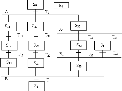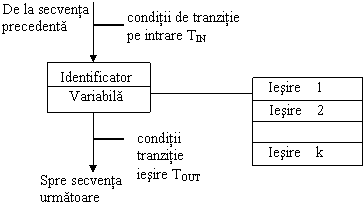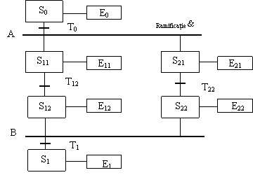 graf orientat definit printr-un cvadruplet - - Simbolizarea Grafcet-ului nu este unica. Īn literatura se pot īntālni diverse moduri de reprezentare. Īn figura 11.4 este prezentata o metoda utilizata frecvent īn aplicatii de conducere a proceselor industriale. O secventa este reprezentata printr-un dreptunghi (sau un cerc) si definita printr-un identificator de secventa. Acesteia i se asociaza o variabila, de obicei o variabila interna, ce reprezinta suportul fizic al secventei. Asociat identificatorului de secventa si conectat direct la acesta este blocul iesirilor generate īn secventa respectiva. Activarea secventei (variabilei) īnseamna activarea tuturor iesirilor conectate. Īn aceasta reprezentare se mai poate remarca prezenta a doua conditii de tranzitie, prima desemnānd conditiile pentru atingerea secventei iar a doua reprezentānd conditiile pentru evolutia īn secventa urmatoare. Aceste conditii reprezinta fie simple variabile externe, fie functii logice complexe obtinute prin operatori logici specializati. Conexiunile īntre blocurile unui Grafcet se obtin prin linii orizontale si verticale. Liniile verticale desemneaza evolutii iar cele orizontale indica posibilitati de ramificare conditionata sau nu. Īn figura 11.5 sunt prescurtate doua diagrame, prima ca o ramificare de tip SAU, a doua cu o ramificare sI.