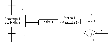 Figura 11.5 b Un Grafcet poate fi īntotdeauna echivalat cu o organigrama (graf) de stari, complexitatea translatarii fiind data de gradul de dificultate prin care o secventa se descompune īntr-una sau mai multe stari. Īn cele mai dese cazuri o secventa corespunde unei stari si atunci asimilarea este simpla (figura 11.7). Īn cazurile mai complexe, fiecare secventa se īnlocuieste cu un numar de stari astfel īncāt sa preia toata informatia continuta īn aceasta. Conditiile de tranzitie sīnt bineānteles pastrate. Īn finalul acestei prezentari s-ar putea īncerca aflarea raspunsului la īntrebarea "ce este de preferat, utilizarea organigramei de stari sau a Grafcet-ului?". Este evident ca nu se poate formula un raspuns transant, ambele solutii reprezentānd metode adecvate de lucru. Totusi, īn cazul unor procese industriale complexe, a caror evolutie implica un numar mare de stari, se poate recomanda utilizarea Grafcet-ului, numarul de secvente fiind īn general mai mic decāt cel al starilor si deci suportul fizic solicitat va fi mai redus.