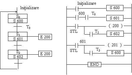 LOD TIN AND Si-1 LOD Si ANDNOT Si+1 ORLOD ORLOD OUT Si LOD Si OUT Iesire 1 OUT Iesire 2 Figura 11.8 Reprezentarea de mai sus defineste metoda generala de implementare a unei secvente. Īn functie de caracteristicile problemei de conducere abordata, aceasta reprezentare poate suferi modificari cantitative care sa permita utilizarea unor elemente si proceduri speciale de implementare oferite de instructiunile unui CLP. Un exemplu īn acest sens īl constituie utilizarea instructiunilor STL asociat cu variabilele 600-647. Acestea din urma au proprietatea unei celule latch, deci devin logic 1 (set) prin conditiile ce sigura activarea variabilei, memoreaza valoarea logica si se reseteaza o data cu activarea celulei urmatoare. Prin aceste proprietati aceste variabile vor constitui suporturi ideale pentru implementarea oricaror secvente. De asemenea, utilizarea instructiunii STL (instructiune de tip master) permite formarea unor bare de conexiune suplimentara pentru comanda unui numar mare de variabile. Pentru exemplificare sa consideram grafcet-ul din figura 11.9.a. Diagrama ladder asociata este prezentata īn figura 11.9.b iar instructiunile corespunzatoare īn figura 11.9.c. Variabila de initializare asigura conditia de set a
