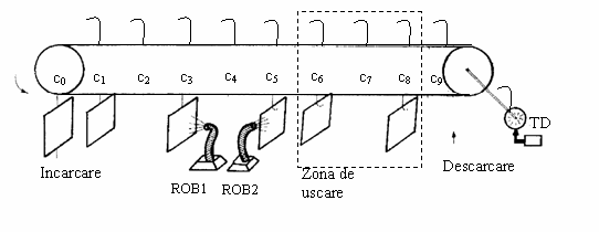 Figura 11.9 11.5. Conducerea unui conveior īntr-o instalatie robotizata de vopsire Ca o prima aplicatie se va aborda problema implementarii sistemului de conducere a unui conveior utilizat pentru transportul unor subansamble (placi) īntr-o instalatie robotizata de vopsire. Īntregul sistem este prezentat īn figura 11.10. Tehnologic, conveiorul este format dintr-un lant transportor cu o latura inferioara activa si una superioara pasiva. Latura activa contine 10 puncte de prindere īn care sunt montate panourile. Acestea sunt prinse īn punctul de īncarcare si avanseaza secvential atāt prin punctele de vopsire cāt si prin cuptorul de uscare si coacere. Linia este prevazuta cu doi roboti ce asigura vopsirea