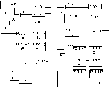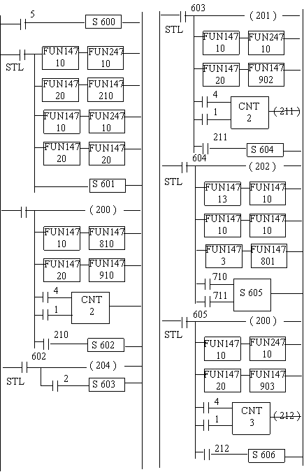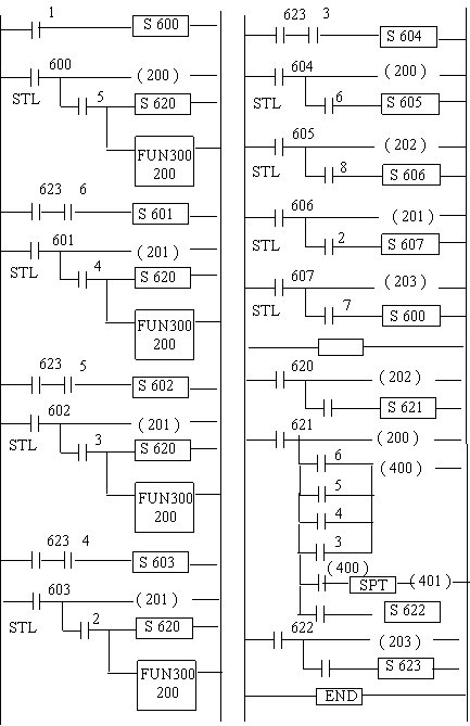Īn finalul subrutinei se utilizeaza instructiunea END ceea ce determina reluarea programului la adresa 0. Īntrucāt variabila 623 era activa, aceasta va determina practic reluarea secventelor īncepānd cu linia variabilei 601. Procedura continua īn acest fel realizānd calea principala a grafcet-ului si apelānd succesiv la subrutina ciclului. Programul detaliat de implementare se obtine transpunānd diagrama īn instructiunile CLP corespunzatoare:
