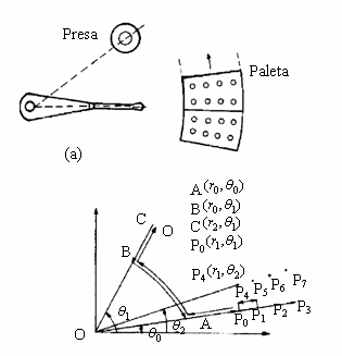 Figura 11.16.b) Se remarca utilizarea unui bloc de numarare CNT 1 programat pentru numararea pīna la valoarea 5. Continutul acesteia este testat prin FUN 201 pentru valori acumulate ce depasesc 1,2,3. Prin iesirile respective 207,208,209 se determina de fapt conditiile NUM1,NUM2,NUM3. Conditia NUMO se obtine prin simpla complementare a conditiei 207. 11.8. Conducerea unui robot īn coordonate cilindice Se va analiza īn continuare posibilitatea implementarii unui sistem de conducere pentru un robot īn coordonate cilindrice ce deserveste o celula de prelucrare. Celula este alimentata cu piese neprelucrate printr-o banda transportoare, piesele fiind dispuse ordonat pe palete, cāte 8 pe fiecare paleta īn grupe de cāte 4 (figura 11.17). Robotul transfera succesiv piesele īn punctul de prelucrare (presa) urmānd o traiectorie impusa. Figura 11.17 Initial robotul se gaseste īn punctul A. Bratul