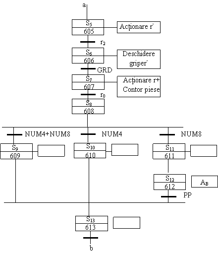 Se remarca prezenta unei ramificatii de tip SAU generata īn secventa s8. Conditiile de evolutie pe anumite ramuri sunt determinate de numarul de piese manipulat si identificat īn secventa s7. Astfel, dupa 4 piese sau 8 piese manipulate, evolutia se realizeaza pe ramurile doi si trei ce determina initializarea parametrilor si r pe anumite valori. Īn celelalte cazuri, evolutia se realizeaza pe prima ramura.
