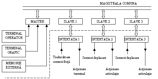 În figura 10.2 este prezentata o astfel de structura bazata pe o ierarhizare master - slave a procesoarelor. Procesorul master - slave stabileste legile generale de conducere a robotului, strategia de functionare a acestuia si împarte fiecarui procesor sclav sarcinile în conducerea fiecarui element. Astfel, un procesor sclav coordoneaza functiile tactile ale mâinii, iar celelalte controleaza miscarea asociata fiecarei articulatii mecanice pe baza informatiilor primite de la traductoarele si senzorii sistemului.