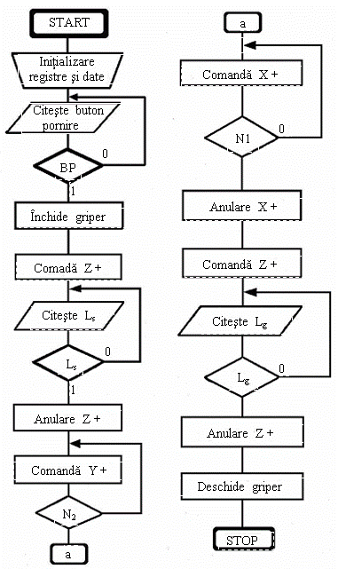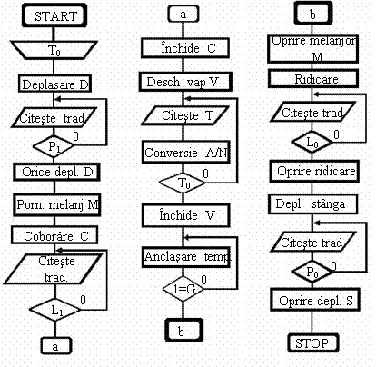 Pentru interpretarea variabilelor asociate limitatoarelor si butonului de pornire s-a considerat ca acestea prin închidere transmit potentialul masei (0 logic) iar prin deschidere formeaza semnal logic 1. În acest sens, instructiunile 70 si 210 blocheaza avansul programului pâna la închiderea contactelor respective.