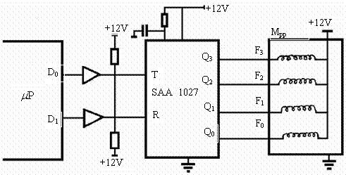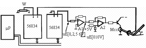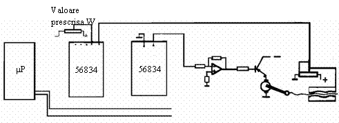 În acest caz se utilizeaza o schema de comanda de tipul celei din figura 10.29. Motorul este controlat printr-o tensiune de comanda în domeniul [0,10V] prin intermediul unui amplificator al carui semnal de referinta este fixat la jumatatea domeniului, 5V. La atingerea valorii prescrise, microprocesorul genereaza un semnal de 5V (dupa A1) ceea ce va determina blocarea motorului. Abateri într-un sens sau altul fata de valoarea prescrisa vor produce tensiuni corespunzatoare în jurul tensiunii de 5V.