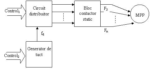 Circuitele prezentate sintetizeaza functia de baza a distribuitoarelor, repartitia semnalelor pe fiecare faza dupa o secventa impusa, avānd ca referinta semnalul unui generator de tact. In afara de acest semnal, distribuitorul poate fi controlat printr-o serie de semnale externe ce īi definesc sensul de baleiaj al fazelor, blocarea sau deblocarea sa si permit chiar modalitati functionale specifice corespunzatoare unor regimuri de accelerare sau decelerare a motorului.