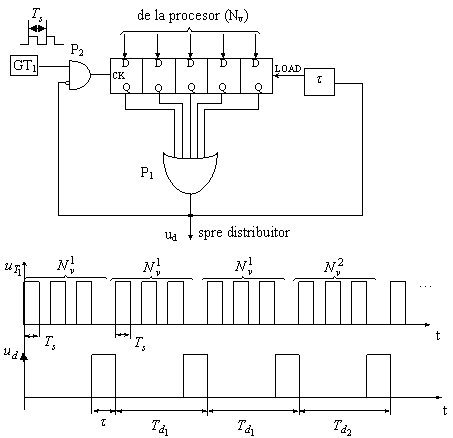 Aceasta relatie este pusa īn evidenta prin diagrama de semnale din figura 3.17,b. Pentru o valoare Nv = 3 īnscrisa periodic īn registru se obtin impulsurile ud cu perioada Td1. Marirea valorii numerice , Nv2 determina o crestere proportionala a perioadei la valoarea Td2.
