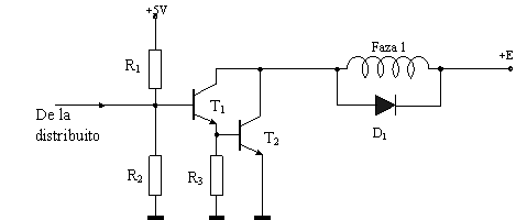 Īn fig 3.18 este reprezentat un astfel de comutator Darlington cuplat pe una din īnfasurarile unui motor pas cu pas. Daca semnalul furnizat de distribuitor este la nivel logic O, tranzistorul T1 se blocheaza determinānd blocarea tranzistorului T2 si anulānd deci curentul īn faza motorului. Pentru o valoare logica 1, tranzistorul T1 intra īn saturatie determinānd conductia lui T2 si, deci, un curent corespunzator prin īnfasurarea motorului.