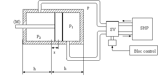 Aceste presiuni sunt create prin asigurarea circulatiei fluidului pe anumite cai de fluid prin intermediul unui servoventil SV de la o sursa de putere hidraulica SPH. Controlul servoventilului este realizat electric.