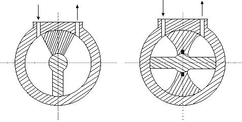 O structura similara este utilizata si pentru actionarea īntr-o miscare de rotatie. Īn figura 3.22 sunt prezentate doua variante constructive, prima realizānd o rotatie sub un unghi maxim de cca 330 , iar a doua de cca 130