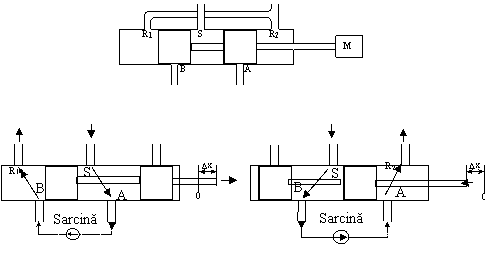 Pentru pozitia de zero a pistonului ambele cai de fluid sunt blocate, elementele pistonului obturānd caile de transmitere a fluidului catre sarcina sau de la aceasta (caile A si B). O deplasare foarte mica Dx spre dreapta a pistonului determina deschiderea traseului fluidic S-A si B-R1 , deci un anumit sens īn sarcina dispozitivului. Deplasarea inversa a pistonului produce blocarea caii de recirculare R1 si deschiderea cailor pe traseele S-B si A-R2 , inversānd astfel sensul fluidului īn sarcina.
