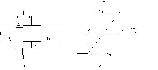 O analiza detaliata a debitului de fluid ce traverseaza o cale de iesire (A sau B) īn functie de pozitia pistonului permite determinarea caracteristicii de transfer servovalvei.