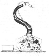 Modelul TEROB-02 (figura 13.12) este un robot al carui brat cuprinde opt elemente articulate prin cuple sferice ceea ce asigura o mare mobilitate întregii structuri mecanice. Comanda robotului se realizeaza prin gruparea elementelor în doua tronsoane, activarea fiecarui element fiind actionata individual prin cabluri actioanate cu motoare pas cu pas ceea ce faciliteaza procedurile de generare a comenzii si simplifica sistemul de comanda prin eliminarea traductoarelor de reactie.