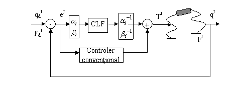 Problema conducerii, la acest nivel ierarhic, consta în determinarea fortelor Fj astfel ca traiectoria reala a sistemului global (obiect plus brate) sa convearga catre traiectoria dorita. Pentru rezolvarea acestei probleme se va considera sistemul din figura 13.54 în care qdj, Fdj desemneaza valorile dorite ale pozitiei si fortei, respectiv iar qj, Fj, valorile reale masurate.