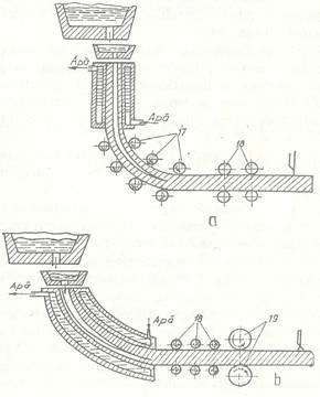 Fig. 1.2. Instalatii de turnare cu fir curb(a) si cu cristalizor curb (b) |