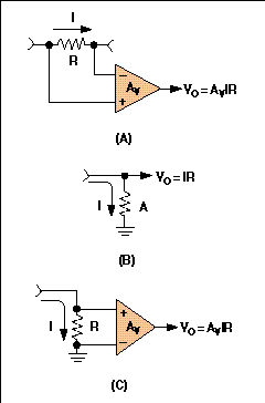 Pentru masurarea flotanta (Figura 2A) folosim un amplificator diferential ce va masura diferenta de potential dintre capetele rezistentei si va furniza la iesire o tensiune fata de masa proportionala cu intrarea. La masurarea fata de masa un capat al rezistorului de masurare este legat la masa. Aici trebuie tinut cont de faptul ca pe conductoarele de masa pot aparea caderi de tensiune importante la curenti mari (Fig. 2C).