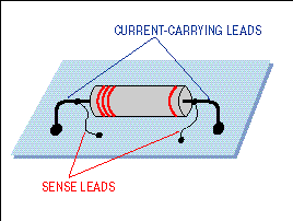Rezistenta parazita serie. Rezistenta electrica a terminalelor rezistorilor de valoare mica (<1W ) poate reprezenta un procentaj bun (1% si mai mult) din valoarea de baza a acestora. Solutia consta īn folosirea a 4 terminale (fig. 3), 2 de curent si 2 pentru masurarea tensiunii. Metoda este cunoscuta ca tehnica de masurare cu 4 fire sau tehnica Kelvin.