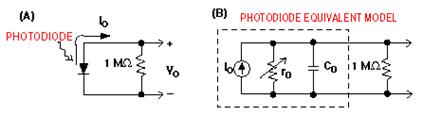 De exemplu, la o fotodioda tipica care genereaza 10m A iluminata si 10nA la īntuneric, s-ar parea ca e suficient un rezistor de 1MW īn paralel pentru a masura caderea de tensiune (Fig. 5A). Problemele care apar astfel sunt legate de faptul ca fotodioda este o sursa de curent neideala cu o impedanta de iesire finita, variabila cu tensiunea de iesire si o tensiune la iesire (<1V) la care poate debita curentul. Pe rezistorul de 1MW cei 10µA nu vor da 10V ci doar ceva sub 1V. Fotodioda este un dispozitiv cu raspuns liniar, dar acest lucru se mentine doar cand folosim rezistori de valoare mica. Un rezistor de 10kW pastreaza liniaritatea raspunsului, dar tensiunea masurata va fi doar de 100mV. Capacitatea intrinseca a fotodiodei, tipic 100pF, īn paralel cu rezistorul de 1MW limiteaza puternic raspunsul īn frecventa la circa 1600Hz.
