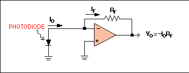 Un convertor I-U cu amplificator operational (Fig. 6) solutoneaza multe din aceste probleme. Tensiunea de iesire a operationalului va cobora fata de masa pana acolo unde curentul IF prin rezistenta de reactie RF egaleaza curentul fotogenerat Io , facand tensiunea din nodul sumator, intrarea "-", egala cu cea de la intrarea "+", 0V.