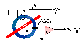 O metoda de evitare a comportarii neliniare a concentratorului de flux si a senzorului magnetic foloseste compensarea curentului de masurat cu un curent cunoscut (fig, 10). Un amplificator operational injecteaza curent prin bucla de reactie (rezistorul si bobina de compensare) pentru a aduce la zero tensiunea Hall si implicit fluxul. Tensiunea de iesire a operationalului este proportionala cu curentul masurat. Folosind bobine de compensare cu multe spire este posibil sa compensam efectul curentului mare de masurat cu un curent de compensare mult mai mic. Rapoarte de peste 1000:1 īntre numarul spirelor din bobina compensatoare si numarul spirelor din conductorul de masurat fac posibila masurarea curentilor de sute de amperi folosind curenti de compensare de zeci de mA. Fiindca fluxul magnetic prin tor este aproape zero raspunsul senzorului de curent nu va fi afectat de saturatia magnetica si de materialul torului īn general, ci doar de cat curent de compensare poate da circuitul de reactie.