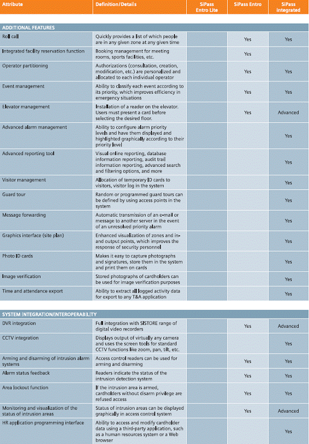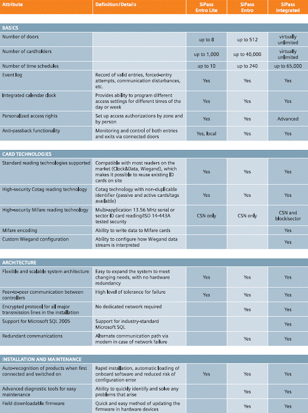 Pentru a va facilita alegerea, pe pegina urmatoare este prezentat un tabel compartiv al celor trei sisteme principale - SiPass Entro Lite, SiPass Entro, SiPass integrat.