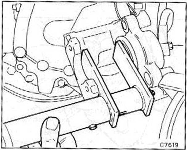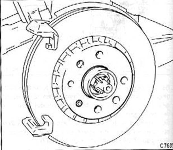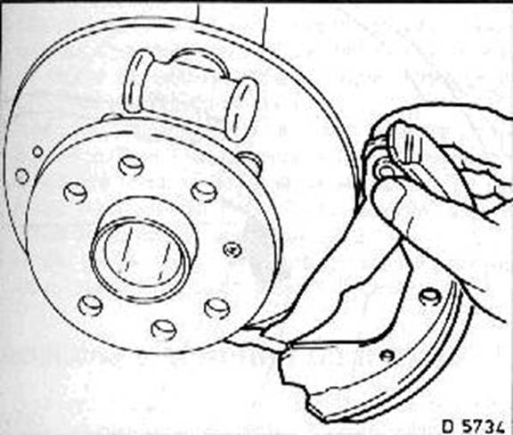 -Se scot placutele de frana si placa intermediara cu ajutorul unui cleste,a unei subelnite sa a unui extractor.In caz de placute de frana blocate datorita ruginei,este necesar un dispozitiv special de extragere(de ex.de la HAZET).