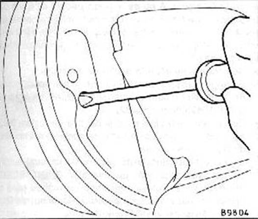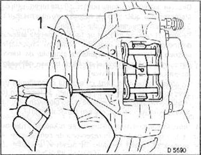 -Se demonteaza stifturile de fixare dinspre exterior spre interior din etrierul de frana,cu ajutorul unui dorn sau a unui cui(diametru de cca. 3 mm).A se avea grija ca arcurile de fixare ale placutei san u sara.