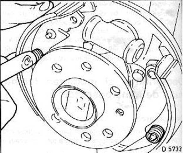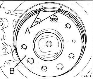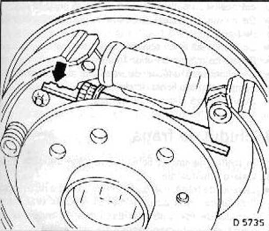 -Daca tamburul de frana nu se poate demointa,se poate ca acesta sa fie uzat.In acest caz,se procedeaza dupa cum urmeaza:se scoate dopul de pe partea posterioara a suportului de frana si se apasa cu surubelnita pe parghia sabotului franei de mana ,pana cand acesta ajunge pe cantul sabotului de frana.Prin aceasta,arcul de rapel poate trage sabotul de frana inapoi si tamburul de frana se poate demonta.