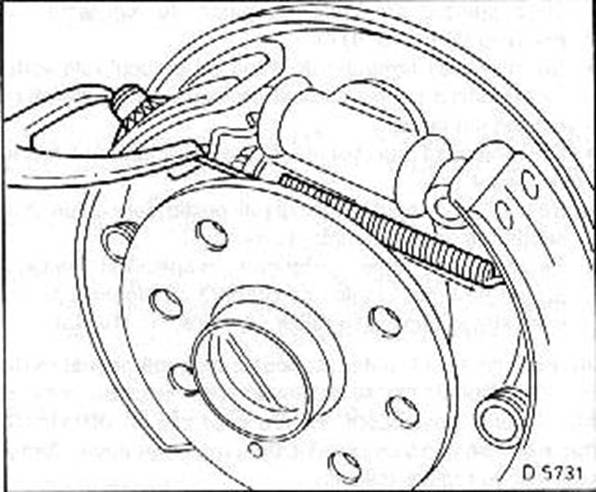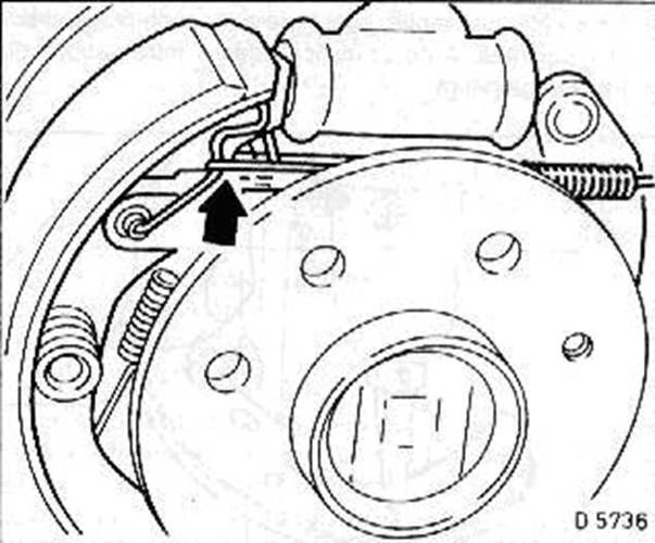 -Se decupleaza arcul de retractare,cu ajutorul unui cleste de arcuri de frana,de exemplu HAZET 797.Demontarea este posibila si cu un cleste normal,insa este mai dificila.