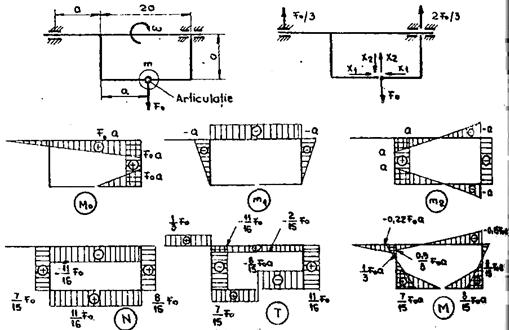 Forta de inertie este F0 = m a . Sistemul este static nedeterminat. Se desface articulatia interioara si se obtine sistemul fundamental, la care necunoscutele static nedeterminate sunt eforturile X1 (forta axiala) si X2 (forta taietoare). Se traseaza diagramele M0 , m1 , m2 si se calculeaa coeficientii ij , rezultând: