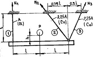 6. Sa se determine tensiunile maxime la barele sistemului din figura 3, daca P = 2,5 kN, l = 1,2 m, h = 5 mm, A = 200 mm2, EOL = 1,5 ECu = E = 21 · 104 N/mm2.