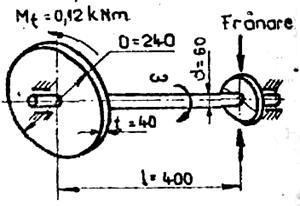 8. Sa se calculeze tensiunea tangentiala maxima din arborele din fgiura 5, considerând frânarea brusca. Se neglijeaza efectul masei arborelui. Se dau: ω = 25 rad/s; G = 8,1 · 104 N/mm2, γ = 7,8 · 10-5 N/mm3 , g = 9,8 m/s2.