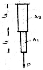 Sa se determine la ce valori ale fortei P cele doua segmente ale barei din figura 2 intra succesiv în domeniul plastic si ce tensiuni si deformatii specifice iau nastere în cele doua cazuri. Sa se determine apoi deformatia totala si deformatia remanenta la descarcare. Se dau: c = 360 N/mm2; E = 125 Ep = 2 · 105 N/mm2; A1 = 600 mm2 ; A2 = 800 mm2l l1 = 1,2 m; l2 = 1,6 m.