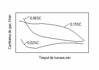 Din diagrama rezulta ca la continuturi mai mari de C (0,15%C) la inceput fierberea este mai putin intensa decat la continuturi mici de C (0,06) din cauza cantitatii insuficiente de oxigen ([C]*[O]=ct), deci si cantitatea de gaze rezultata este mai mica. Intensificarea fierberii avand loc pe parcursul solidificarii. Acelasi lucru se intampla si la otelurile cu continut foarte scazut de C (0,02%) unde procesul este ingreunat din cauza continutului prea mic de carbon.