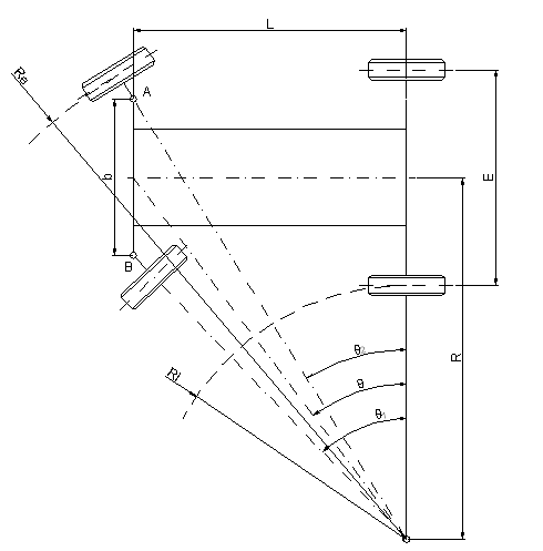 în care L reprezinta ampatamentul autovehiculului si b distanta dintre pivotii rotilor directoare.