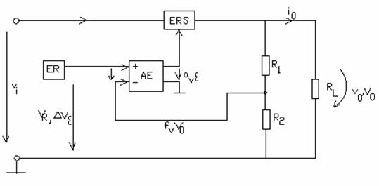 Amplificatorul de eroare AE elaboreaza o comanda catre elementul de reglare ERS care determina la iesire o variatie v"0. În aceste conditii variatia tensiunii de iesire este formata din doua componente