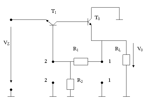 Pe baza schemei de principiu din figura 8.4 poate fi realizat un stabilizator cu element de reglaj serie, utilizând tranzistori bipolari, ca în figura 8.5.