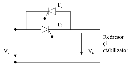 Variatorul de tensiune, format din tiristorii T1 si T2, permite controlul tensiunii de alimentare a stabilizatorului prin modificarea unghiului de comanda. În conditii de scurcircuit în stabilizator se întrerup impulsurile de comanda a tiristorilor, separând stabilizatorul de sursa de alimentare.