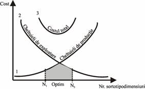 Stabilirea numarului optim de tipuri de produse din aceeasi grupa se face in functie de cheltuielile in productie si cele din exploatare, asa cum rezulta din fig. 1. Cu cat numarul de tipuri creste, se reduc cheltuielile din exploatare, dar cresc cele din productie. Zona optima se afla intre N1 si N2, respectiv la intersectia curbelor 1 si 2, unde nivelul cheltuielilor totale (productie si exploatare) se afla la nivelul minim (3).