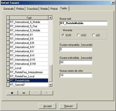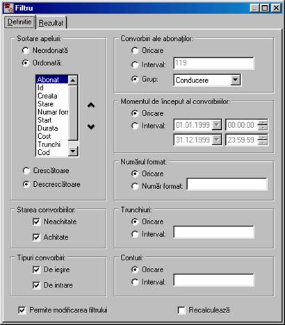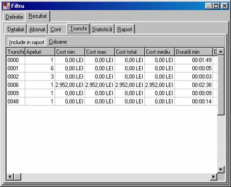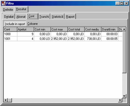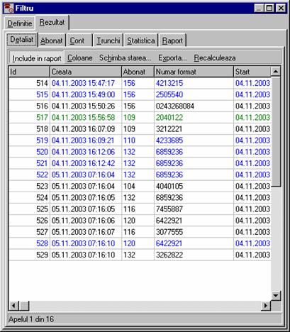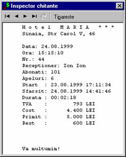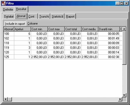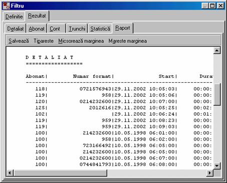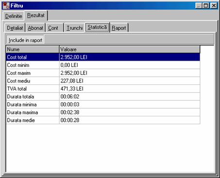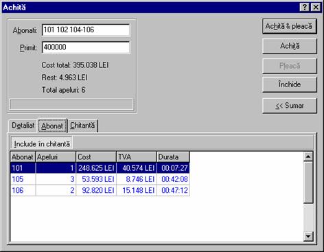 costul de la RomTelecom la care s-a adaugat profitul (vezi Forma detaliata a ferestrei contine în plus un carnet cu trei pagini: Detaliat, Abonat si Chitanta. În pagina Detaliat sunt afisate detaliile convorbirilor efectuate. Daca doriti ca datele din aceasta pagina sa fie incluse în chitanta atunci butonul Include în chitanta trebuie sa fie în pozitia jos. Folositi comanda Paguba pentru a elimina apeluri contestate.