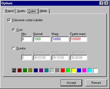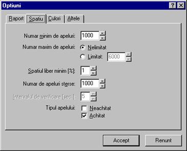 Numarul minim de apeluri este numarul de apeluri ce vor ramâne dupa micsorarea bazei de date. Numarul de apeluri sterse este numarul de apeluri ce va fi sters când se constata depasirea numarului maxim de apeluri sau micsorarea spatiului liber sub spatiul liber minim. Pagina Culori permite utilizatorului sa aleaga modul de afisare al apelurilor: normal sau în codul culorilor.