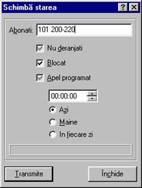 Completati câmpul Abonati. Folositi '-' pentru a specifica intervale de abonati. Separati abonatii cu spatiu. Numarul de cifre folosite pentru un abonat trebuie sa fie egal cu cel specificat prin comanda Configuratie | Optiuni., câmpul Altele | Numar fix de cifre. Daca nu doriti schimbarea starii terminalului atunci câmpul asociat trebuie pus în cea de-a treia stare posibila (culoarea gri). Comenzile de schimbare a starii terminalelor sunt transmise la apasarea butonului Transmite. |