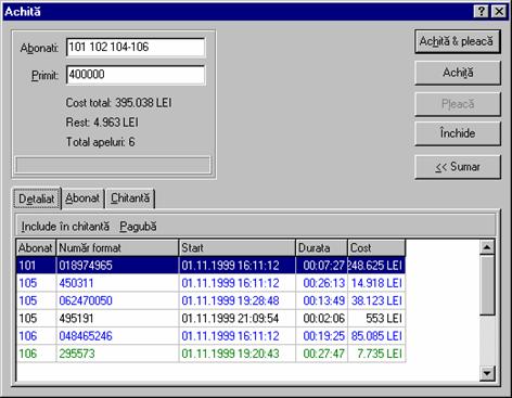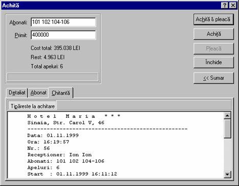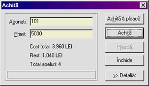 Fereastra are doua forme: sumara si detaliata; comutarea se face apasând butonul din coltul dreapta-jos. Forma detaliata este utilizata in special pentru examinarea detaliilor si pentru modificarea optiunilor. În câmpul Abonati apasati Ctrl + Spatiu pentru a deschide lista abonatilor disponibil. Butoanele Achita & pleaca si Achita sunt active numai daca datele introduse în câmpul Abonati sunt corecte si costul total nu este zero si suma primita este cel putin egala cu suma ce trebuie platita. Butonul Pleaca este activ numai daca suma ce trebuie platita este zero. Costul convorbirilor este
