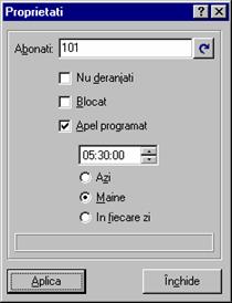 Comanda folosita la vizualizarea / schimbarea proprietatilor abonatilor. În fereastra Proprietati completati câmpul Abonati si apasati butonul Aplica. În câmpul Abonati apasati Ctrl + Spatiu pentru a deschide lista abonatilor disponibil.