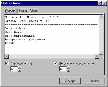 Cuvintele cheie ce pot fi folosite în descrierea formatului sunt: data, ora, pagini, operator, rezultat (text). Cuvintele cheie trebuie precedate de caracterul '#'. La generarea chitantei cuvintele cheie vor fi înlocuite de datele corespunzatoare. Apasati butonul din dreapta al mouse-ului pentru lista cuvintelor cheie disponibile. Chitanta este generata în format text, de aceea marginea la stânga se masoara în numar de caractere iar lungimea paginii în numar de linii. Bifati optiunea Pagina noua daca doriti împartirea chitantei în pagini si apoi specificati lungimea paginii. Bifati optiunea Margine la stânga si apoi specificati marimea marginii. În pagina Spatiu sunt definiti parametrii de micsorare a bazei de date pentru hotel.