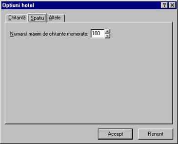 Numarul de chitante memorate de program poate fi modificat cu ajutorul comenzii Hotel | Optiuni, pagina Spatiu. |